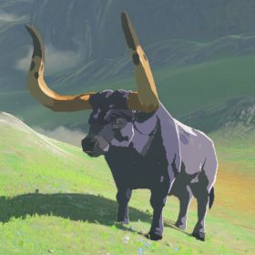 These wild cows come equipped with big, strong horns. They live off grass that grows near the waterfront. Their meat is considered to be high quality, so they're a common target among hunters. Fun Fact: the domesticated Hateno cow, often raised in villages, was bred through selective breeding of these.